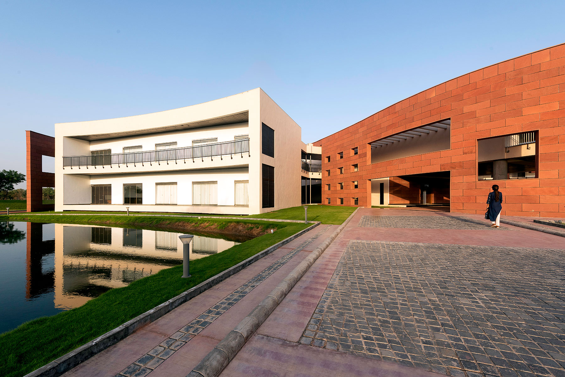 The structure is finished in exposed concrete both outside and inside, and bands of red Agra stone on the east, south and north external elevations contrast with the grey concrete.
